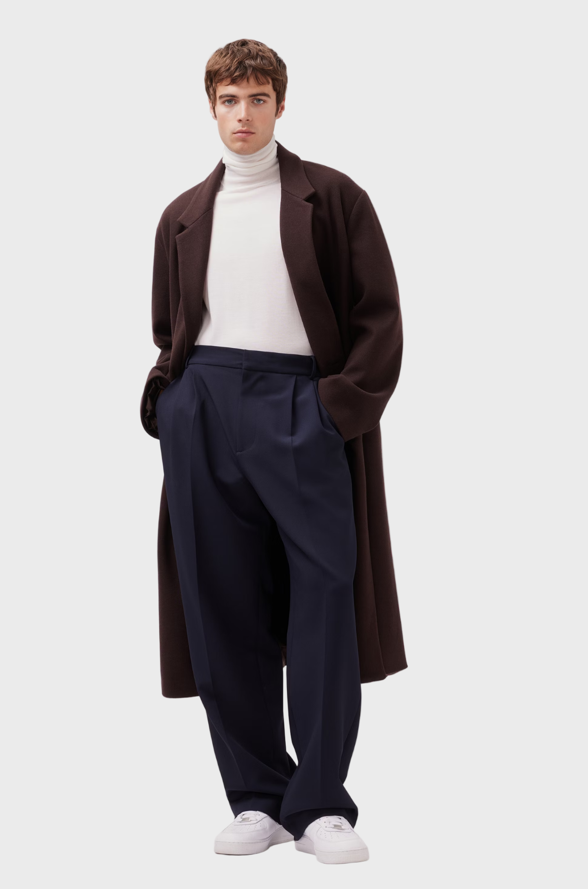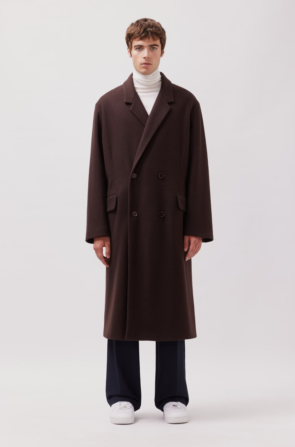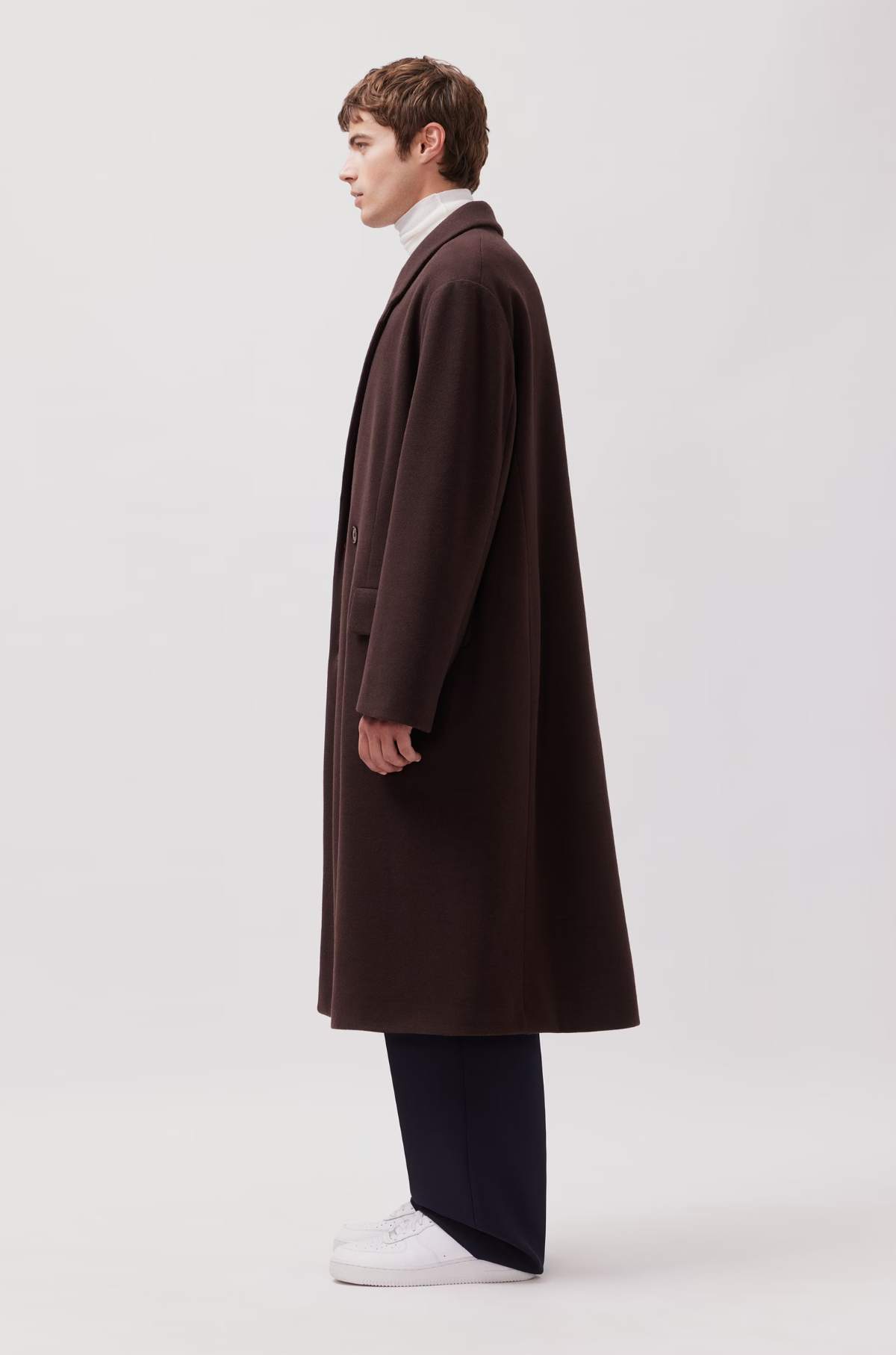 Ein Statement-Mantel, der mit urbaner Weite und minimalistischem Design überzeugt. Der Oversized Mantel in sattem Braun vereint hochwertige Materialqualität mit markant cleanem Look.